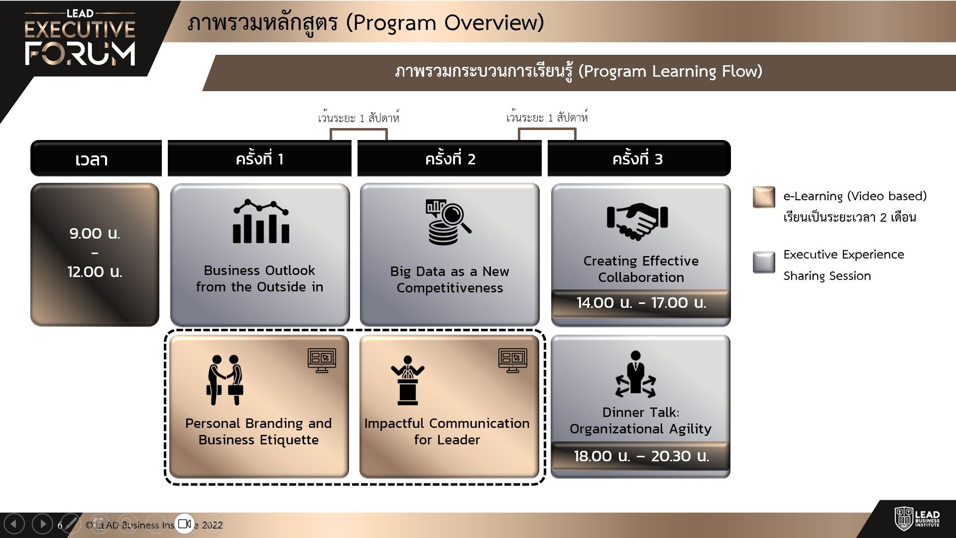สถาบัน ลีด บิซิเนส ตระหนักถึงความสำคัญในการพัฒนาผู้บริหารระดับ 13-14 ให้เข้าใจถึงบทบาทสำคัญของผู้นำองค์กร ในการวิเคราะห์ภาพรวมของธุรกิจ การสื่อสารกับทั้งบุคลากรภายในองค์กร บุคคลภายนอก และผู้มีส่วนได้ส่วนเสีย การสร้างความร่วมมือเพื่อรับมือกับสถานการณ์ปัจจุบัน และความท้าทายในอนาคตได้อย่างมีประสิทธิภาพ สถาบันฯ จึงขอนำเสนอ โครงการ Executive Forum หลักสูตรที่ออกแบบสำหรับผู้บริหารระดับสูง โดยมุ่งเน้นการเรียนรู้ผ่านการถ่ายทอดประสบการณ์ตรงของผู้นำองค์กรต่างๆ เปิดโอกาสให้ผู้เข้ารับการฝึกอบรมสามารถเรียนรู้ เปิดมุมมอง จากกรณีศึกษาและสามารถนำไปประยุกต์ในการทำงานอย่างมีประสิทธิผล